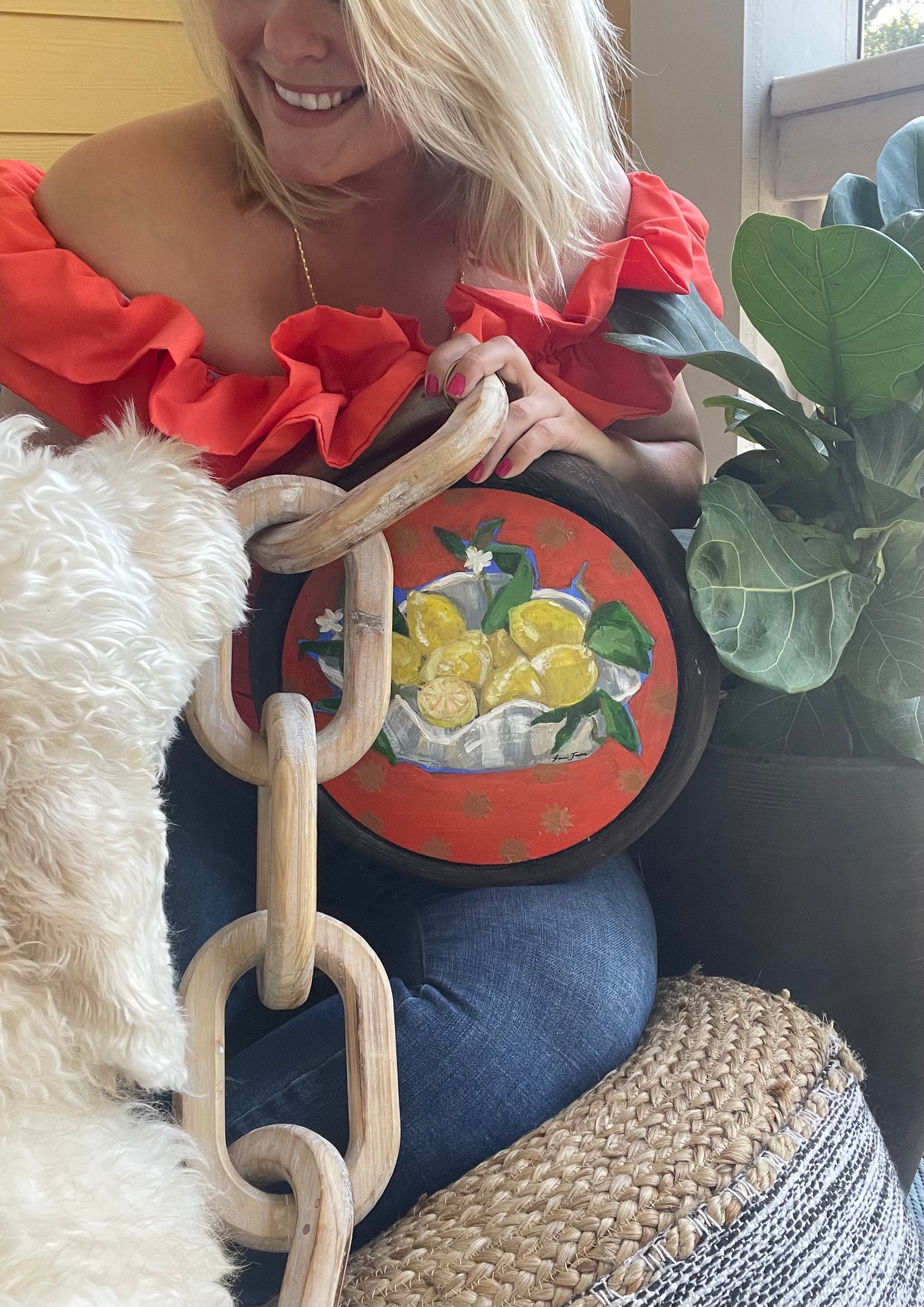 Art by Lauren Jane presents her exclusive and one of a kind Paulownia wall charms. Each piece includes hardware to hang, decorative chain and round paulownia wood frame. Wild Lemons is acrylic paint on a birch wood panel. The chain color can be customized. Plese email artbylaurenjane@gmail.com with any questions.